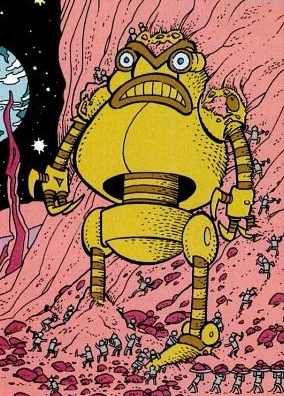 The natives of the Ruby Moon's planet kidnapped several Earthlings and turned them into robotic slaves for the purpose of digging out Kolossus so that he in turn could invade and conquer Earth. However, Pedrobot managed to make himself large through sheer willpower or something and entered hand-to-hand combat with the behemoth. Making a tactical retreat, Pedrobot stumbled upon the remote and, thinking it was a ray gun, folded up Kolossus and became a hero yet again.