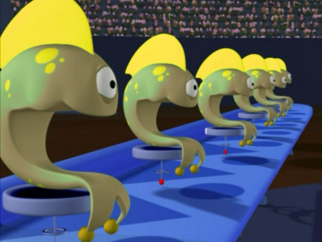 Yellow-Capped Whopper Dingies are amphibians resembling large one-eyed tadpoles with big yellow tufts on their heads for mating display. They have superb balance, lacking limbs and yet being able to stand on the tips of their tails. They are popular pets thanks in large part to their use as game pieces in the game Squid-Tac-Toad.